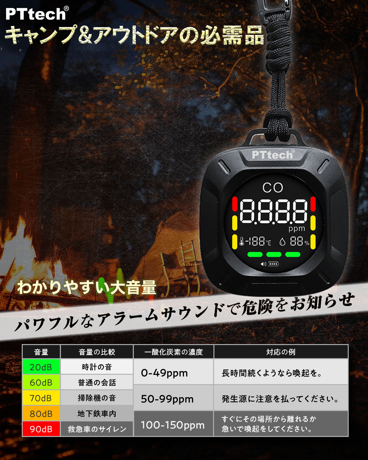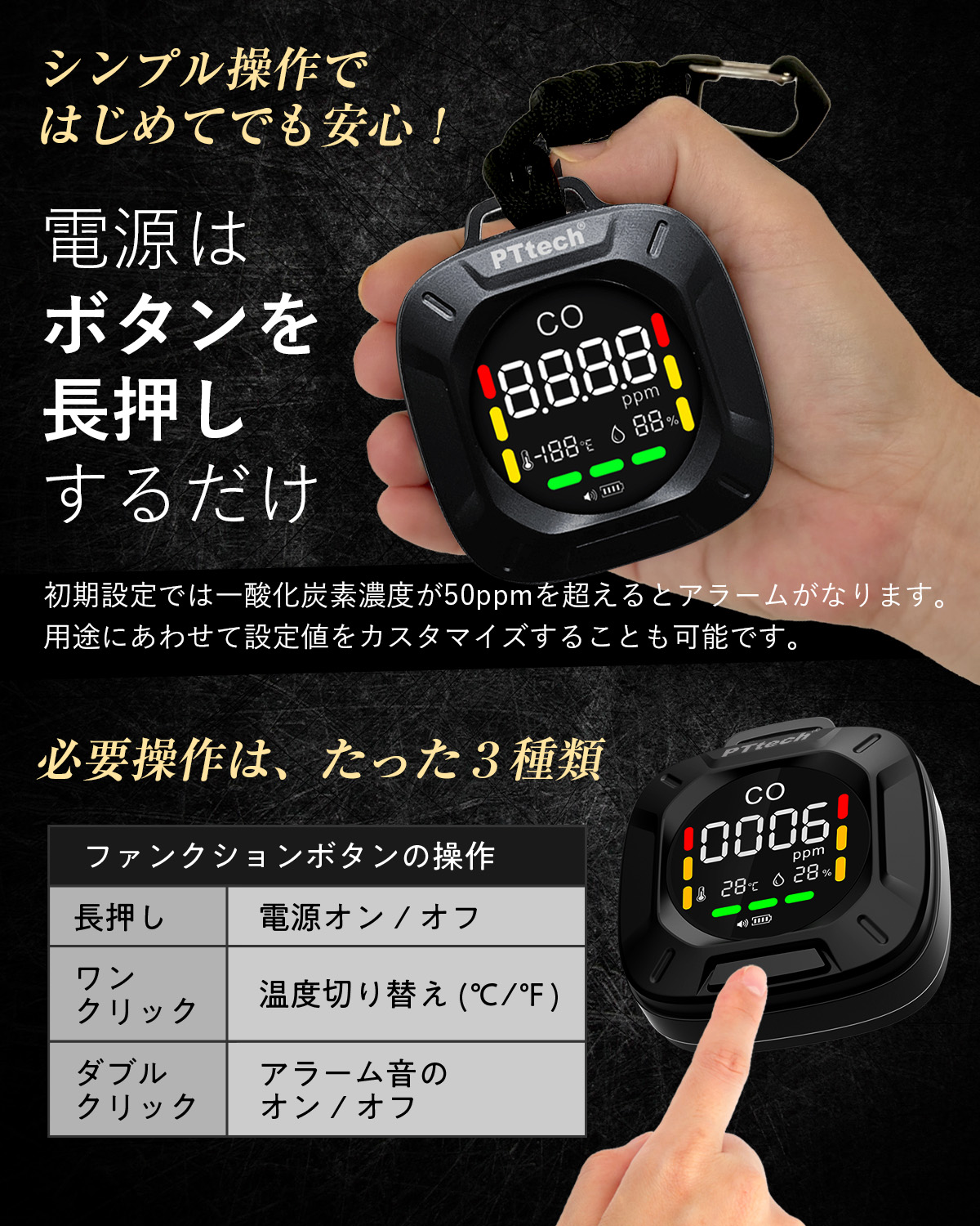 一酸化炭素濃度、50ppm以上を感知すると警報音が鳴ります。(こちらの値は用途に合わせて変更が可能です。)