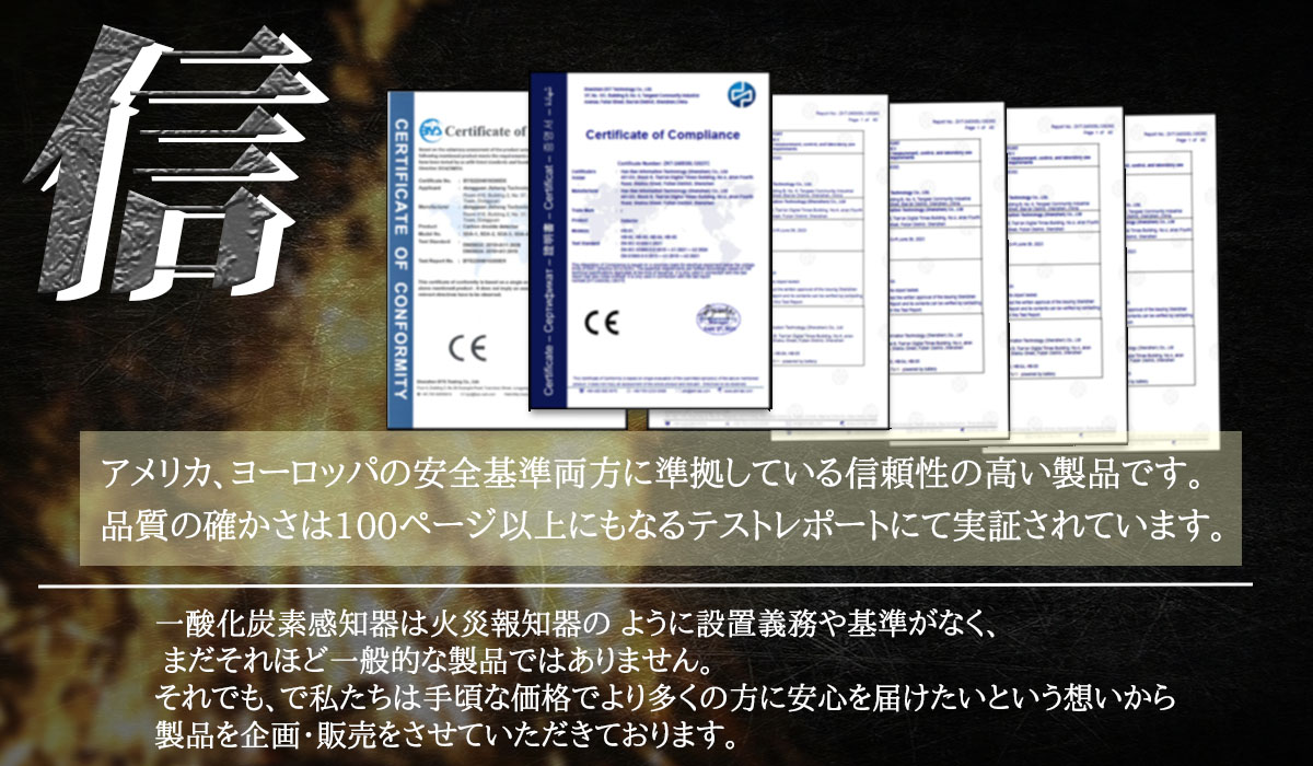 日本では一酸化炭素の警報器の設置は義務化されておらずまだまだ高価であまり普及していません。一方国外では設置が義務化されていたりと、日本より身近で安価に販売されています。なので中国製でも、海外で安価に普及している製品をきちんと日本で検品し、もっと皆様に気軽に、まずは一酸化炭素チェッカーを手にして欲しいとの思いでお届けをさせていただいております。